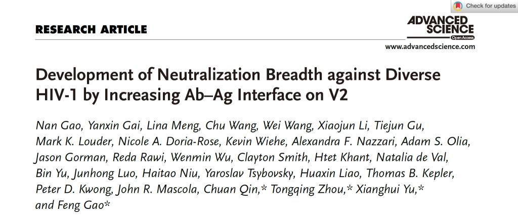高峰教授、于湘晖教授科研团队针对目前已知报道感染时间最长的恒河猴动物模型作为研究对象,分析其体内诱导产生的广谱中和活性。通过抗体分离获得针对特异表位的J038广谱中和抗体谱系。该工作研究抗体谱系以及体内病毒包膜蛋白的突变情况,追溯广谱中和抗体的进化过程以及与SHIV共同进化的过程,分析非人类灵长动物体内与人体内产生广谱中和抗体的类似性,为更好地应用恒河猴模型来评价HIV-1疫苗提供理论和实验依据。该J038谱系抗体的发育细节和识别特征为今后V2靶向广谱中和抗体的研究和应用提供了新的见解。该研究成果于2022年03月24日在学术期刊《Advanced Science》在线发表(Development of Neutralization Breadth against Diverse HIV-1 by Increasing Ab–Ag Interface on V2)。论文第一完成单位为楠楠漫画