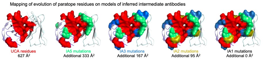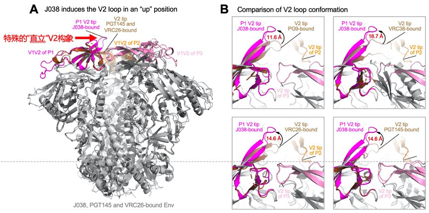 并且通过与美国国立卫生研究院疫苗研究中心的周同庆教授合作综合运用冷冻电镜晶体结构分析,同源建模及病毒单基因组测序等技术系统地研究SHIV感染恒河猴体内J038谱系广谱中和抗体的产生和进化机制以及与人体产生广谱中和抗体的类似性,发现J038抗体与Env特殊的“直立”V2环相结合,使得广谱中和抗体更易与Env上的CD4结合区域相结合(图2),并揭示了一种全新的 V2特异性广谱中和抗体的产生及进化机制,即这类广谱中和抗体的广谱性是在进化成熟过程中通过不断地增加于包膜蛋白及其表面的多糖的结合面积来获得的 (图3)。 图中展示了对J038谱系进化各阶段过渡抗体的结合位点进行同源建模分析,发现J038谱系抗体在进化的过程中逐渐积累了对包膜蛋白V2区及其表面的N156和N160位的多聚糖的结合界面。在进化层面上的分析更加深入的表明了本研究的重大意义。这些结果为设计以HIV-1包膜蛋白为基础的新型艾滋病疫苗策略提供了思路。