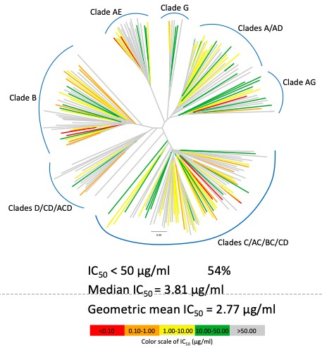 随着抗体分离技术的成熟以及对于抗体-抗原进化机制的深入了解,大量针对HIV-1的广谱中和抗体被分离并被进行深入研究。由于遗传背景的同源性,非人类灵长动物模型广泛应用于艾滋病研究领域。然而对类似于人源广谱中和抗体是否可以在非人类灵长动物中产生以及它们是否以与在人体内的抗体相似的方式进化成熟,人们知之甚少。对此高峰教授、于湘晖教授团队长期跟踪研究了感染携带HIV-1包膜蛋白基因的人/猴免疫缺陷嵌合病毒(SHIV)长达7年的中国源恒河猴,并在它们体内检测到与人源广谱中和抗体具有相似的表位的HIV-1广谱中和活性的产生。随后该团队在恒河猴G1015R体内分离到针对HIV-1包膜蛋白V2区的广谱中和抗体J038谱系(其中J038广谱度达到~54%),这也是目前报道的分离自SHIV感染的猴体内广谱度最高的抗体 (图1)。