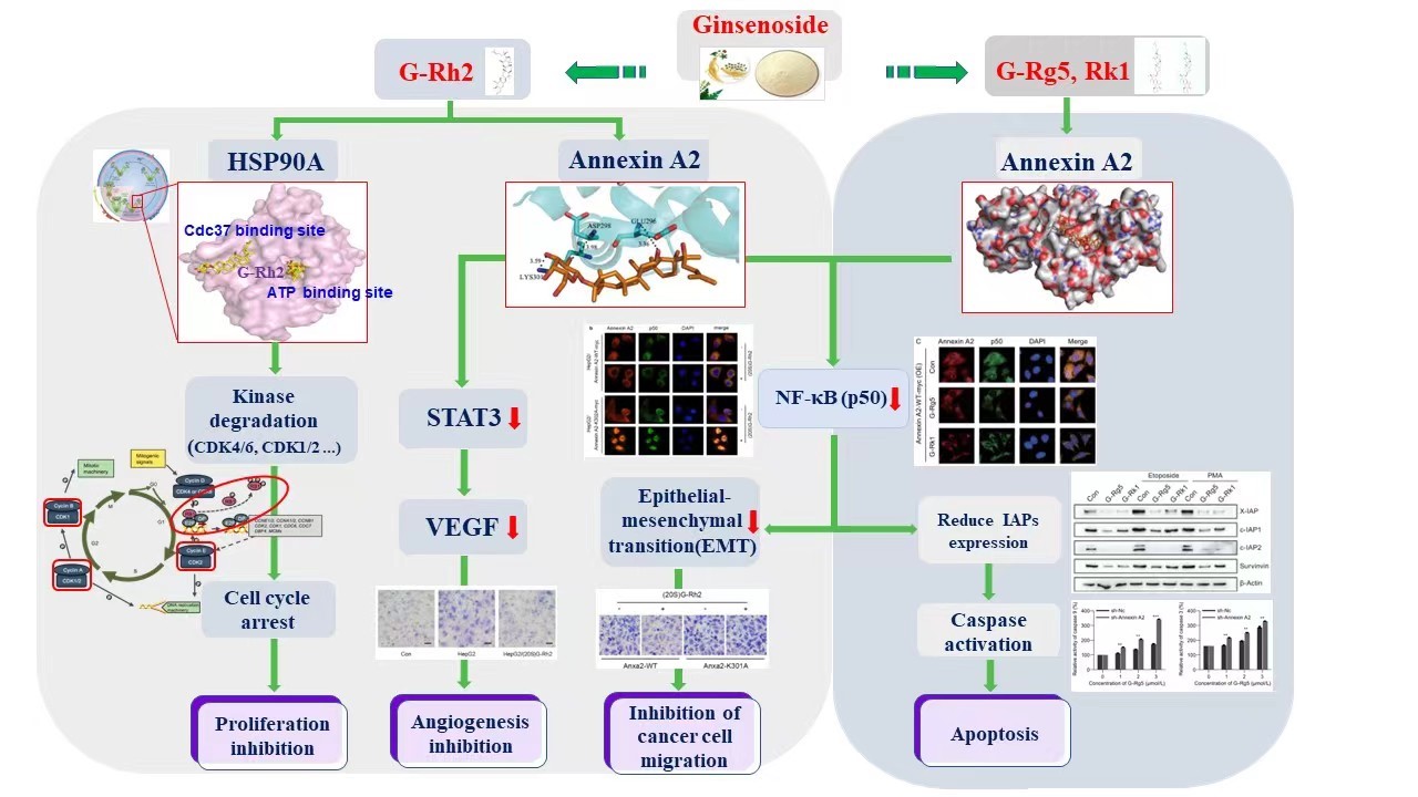 金英花教授科研团队暨2017年首次报道人参皂苷Rh2的人类靶点的研究之后,又取得了一系列新进展:1HSP90蛋白是肝癌、膀胱癌、食管癌和肺癌等多种癌症中高表达并与患者不良预后正相关的癌症标志物蛋白质。其作为分子伴侣,介导癌细胞中大量存在的突变蛋白质的折叠与稳定,进而助力癌细胞的生存、生长与转移。金英花教授科研团队在前期利用噬菌体展示技术的人参皂苷人类靶点筛选工作中惊喜地发现Hsp90A是人参皂苷Rh2的潜在靶点蛋白质,通过分子对接计算与蛋白质热漂移分析证明了人参皂苷Rh2可同时结合Hsp90A氨基段的ATP结合位点和MCCDC37结合结构域,高效抑制Hsp90A的分子伴侣活性。进一步证明了人参皂苷Rh2Hsp90A的靶向抑制,引发细胞周期的关键调控激酶CDK4/CDK6, CDK1CDK2的蛋白酶体降解,进而抑制Rb蛋白质的磷酸化和细胞周期G0/G1期阻滞。众所周知,Rb通路的变异是细胞癌变的必要条件,因此人参皂苷对Rb通路的有效抑制不仅有利于肝癌、膀胱癌、食管癌和肺癌等Hsp90A高表达的癌症的治疗,同时提示其对肿瘤的普遍防治作用(第一作者陈晨,Int. J. Mol. Sci.2)阐明了人参皂苷Rg5Rk1通过靶向抑制膜联蛋白A2抑制NF-kappa B的转录活性,进而抑制肿瘤细胞的抗药性(第一作者王宇石,Protein Cell);3)证明了人参皂苷G-Rh2通过靶向抑制Annexin A2-STAT3-VEGF途径,抑制肿瘤细胞的促血管生成作用(第一作者王宇石,Int. J. Mol. Sci.);4)通过靶向抑制Annexin A2-NF-kappa B途径抑制肿瘤细胞的转移(第一作者王宇石,Biomolecules)。NF-kappa BSTAT3是肿瘤微环境的形成和维持过程中发挥关键作用的转录因子,稀有人参皂苷对这些转录因子的抑制作用强烈提示:作为天然化合物,人参皂苷可通过靶向多种肿瘤关键调控蛋白质和信号转导通路,有效防止肿瘤的发生、发展和转移。以上研究得到了吉林省科技厅、吉林省省校共建计划专项项目的支持。