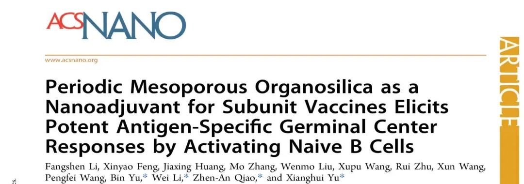 无机合成与制备化学国家重点实验室乔振安教授和复旦大学化学系李伟教授以周期性介孔有机硅(PMO)作为新型亚单位疫苗佐剂,揭示其通过CLR通路直接激活静息B细胞,在免疫后早期引发强效的生发中心反应,并最终诱导机体产生广谱且持久的体液免疫应答和强效的细胞免疫应答。研究论文“Periodic mesoporous organosilica as a nanoadjuvant for subunit vaccines elicits potent antigen-specific germinal center responses by activating naive B cells”发表在《ACS Nano》杂志(影响因子17.1,中科院分区一区)上。论文第一完成单位为楠楠漫画