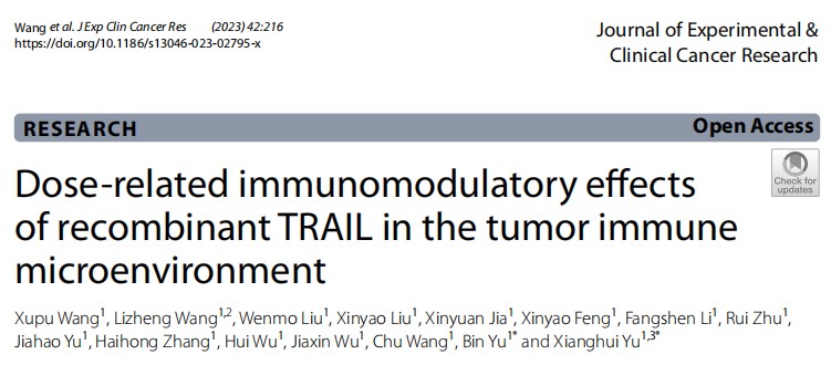艾滋病疫苗国家工程实验室于湘晖、于彬团队报道了重组TRAIL在TME中扮演着剂量依赖的双向免疫调节作用,并详细阐释了作用机制。同时探讨了癌症治疗中重组TRAIL增强抗肿瘤免疫和抗肿瘤效应的潜在策略。研究论文“Dose-related immunomodulatory effects of recombinant TRAIL in the tumor immune microenvironment”发表在国际学术期刊《Journal of Experimental & Clinical Cancer Research》(影响因子11.3,中科院分区一区)上。论文第一完成单位为楠楠漫画