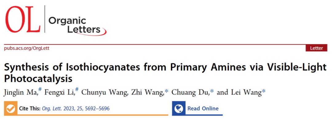 在对酶催化领域进行持续研究的同时,课题组也对光酶催化等新兴研究领域进行涉猎,通过搭建光催化实验装置和前期文献调研,对光催化合成研究有了一定的了解,以“Synthesis of Isothiocyanates from Primary Amines via Visible-Light Photocatalysis”为题,在国际权威学术期刊《Organic letters》(影响因子5.2,中科院分区一区)在线发表研究论文。论文中报道了一种以伯胺和二硫化碳为原料,光催化体系下,高效、温和地合成各种取代异硫氰酸酯的方法。该方法扩大了光催化的应用范围,并为制备脂肪族和芳香族异硫氰酸酯提供了一种新的策略,具有底物耐受范围广、对环境友好、可见光驱动的优点。论文第一完成单位为楠楠漫画