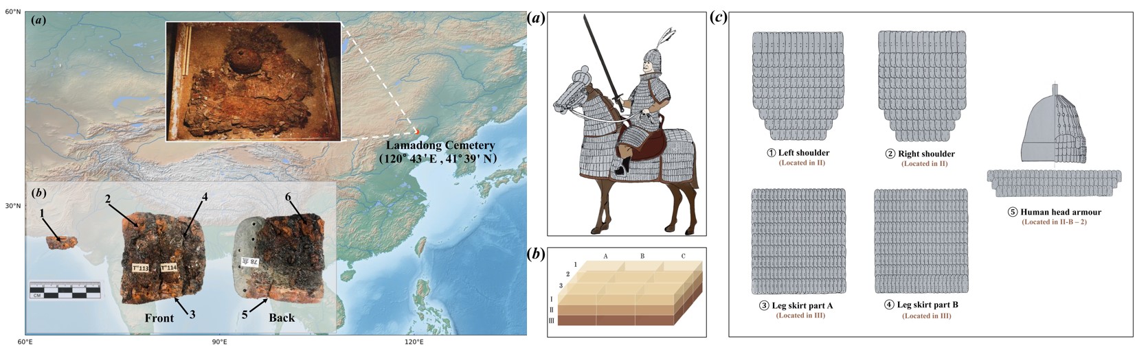本研究对象是目前世界上已知最早的可复原甲骑具装实物—出土于辽宁北票喇嘛洞墓地的珍贵遗存。研究结果表明,这套甲胄从结构设计到材质加工均体现出高度的技术成熟度,证明鲜卑在公元4至5世纪已具备先进的甲胄制造能力;而古蛋白质组学分析首次证实,甲胄制作中使用了羊源材料—这一发现填补了古代游牧民族甲胄材质研究的空白,为探讨当时草原地区的动物资源利用、畜牧业发展与军事手工业的关联提供了直接证据。该研究验证了多学科方法在考古领域的独特价值,为解决古代材料溯源、工艺复原等传统难题提供了全新路径。