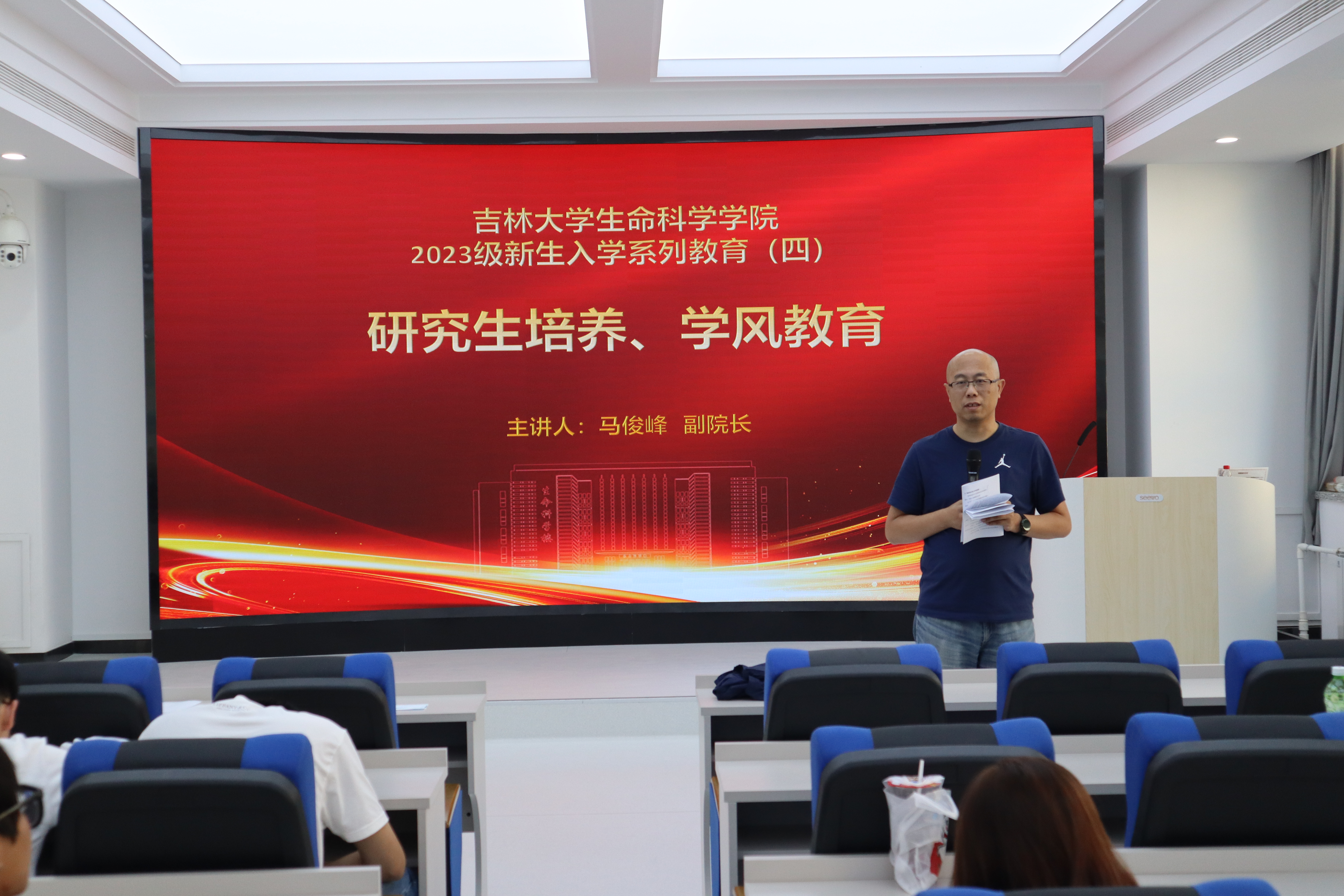 副院长马俊峰主讲,学院党委副书记林相友主持,研究生辅导员任中帅、2023级研究生新生参加讲座。