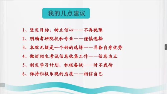 最后马俊锋依次解答了同学们针对考研科目、关键时间节点等方面的问题,建议并鼓励同学们不再犹豫、慎重选择、明确优势、找准信息、把握时机、相信自己!