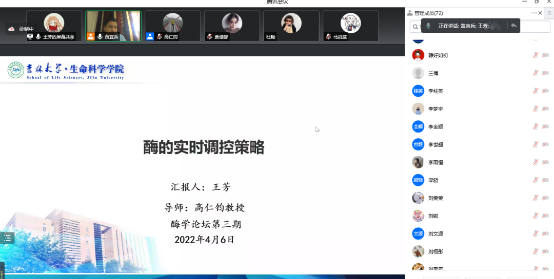积极抗疫增交流,酶学论坛来加油,生科师生齐努力,助力生物“双一流”。2022年4月6日上午10点,第三期酶学论坛继续线上开展。2021级博士研究生王芳同学以“酶的实时调控策略”为全院师生奉献了一场精彩的学术报告,近90名师生参与了本次线上论坛。