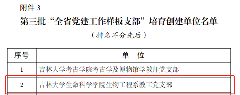 生物工程系教工党支部入选第三批“全省党建工作样板支部”培育创建单位。