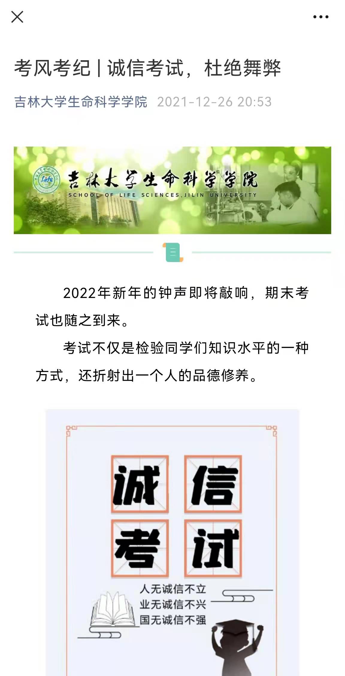 2021年12月26日,院学工办在学院公众号上发布了《考风考纪|诚信考试,杜绝舞弊》的推送,倡导优良学风与诚实诚信,并分年级召开了诚信考试教育动员会,要求全体学生严格遵守考试纪律,做到诚信应试,同时组织全体学生签订了《楠楠漫画