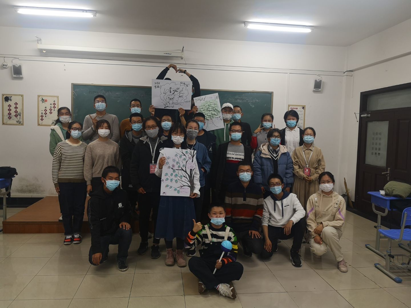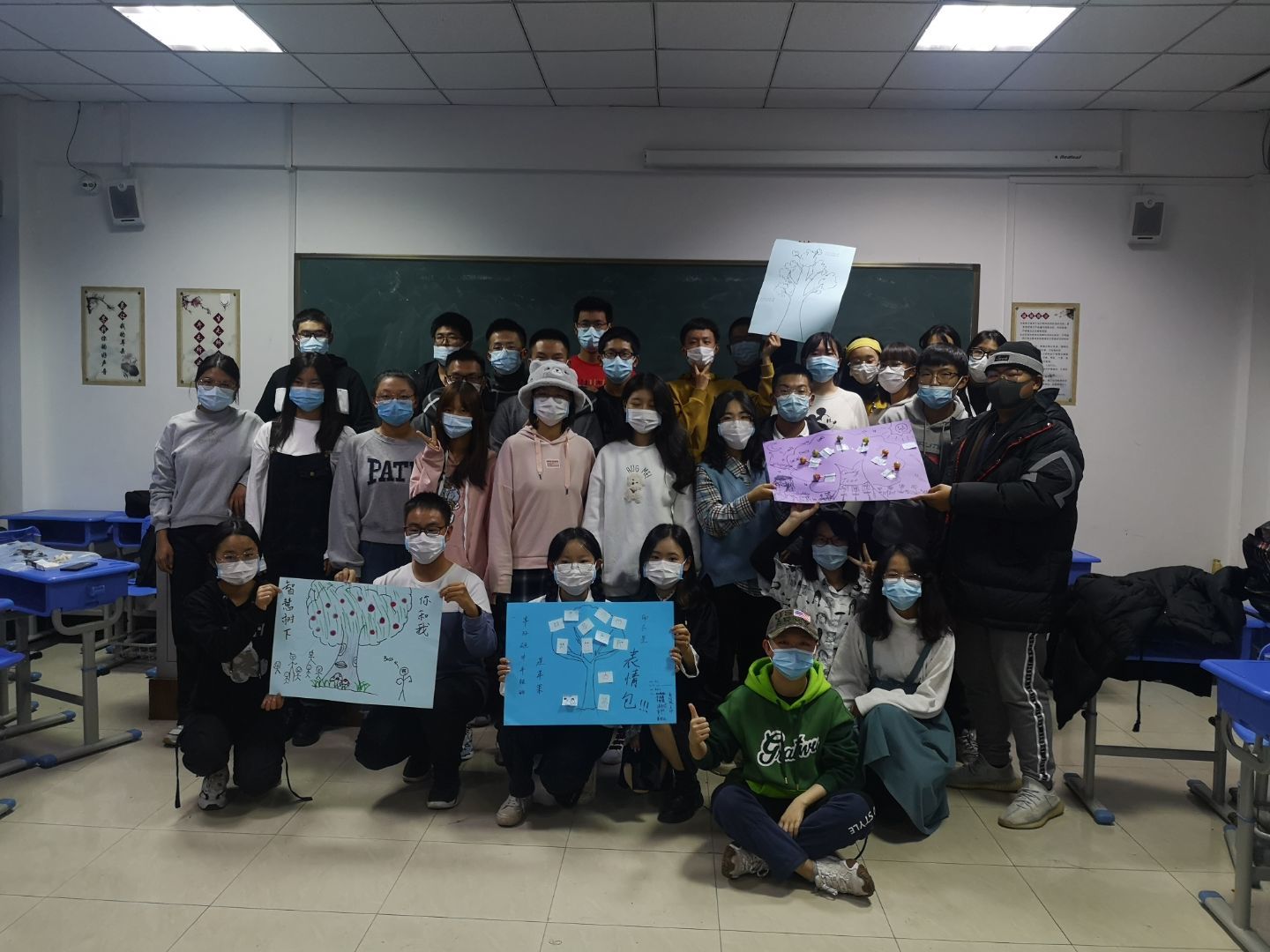 最后,活动在团体树的绘制中落下帷幕,绘制后每个小组推选一人上台为大家展示并讲解画作,在讲解中,讲解员与团队成员心意相通,有了更深层次的思想交流。至此,心理班会圆满成功。