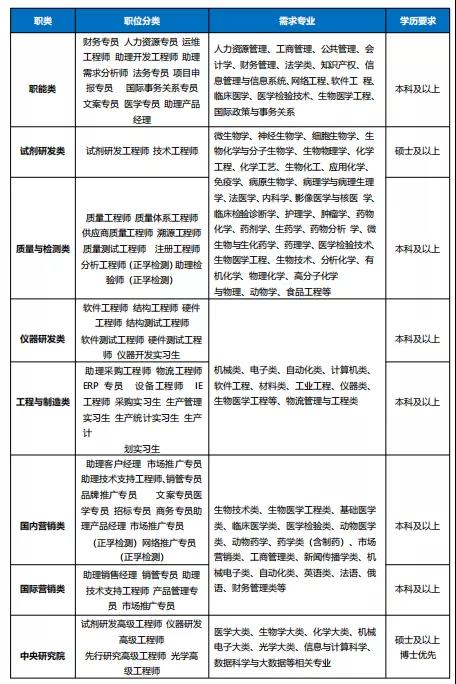 试剂研发类、仪器研发类、国内营销类、国际营销类、职能管理类、质量与注册类、先行与基础研究类(中央研究院)、工程与制造类