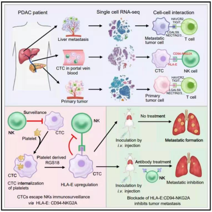 该研究工作的主要创新点包括:1)发现血液循环、原发灶和转移灶肿瘤微环境中肿瘤细胞与免疫细胞间的相互作用显著不同;2)发现CTCs通过免疫检查点分子对HLA-E:CD94-NKG2A逃避宿主免疫监视的新机制;3)证实了阻断免疫检查点HLA-E:CD94-NKG2A可抑制肿瘤转移,为治疗肿瘤转移提供了新的靶点;4)发现CTCs通过内吞血小板获得RGS18基因,从而帮助CTCs逃避NK细胞的免疫监视。