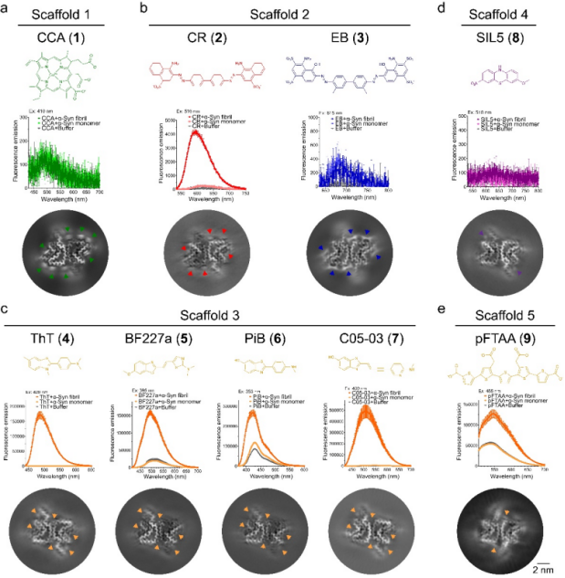 在此项工作中,研究人员首先通过化合物库高通量筛选等方法获得多个能够结合帕金森病致病蛋白α-突触核蛋白(α-synuclein,α-syn)纤维的具有不同骨架的小分子化合物,进一步通过螺旋纤维重构技术解析了包括筛选获得的聚集体的配体,临床前显像示踪剂,以及经典淀粉样蛋白染料等9个不同结构的小分子与α-syn纤维结合的原子结构(图1)。研究人员发现小分子配体-淀粉样蛋白纤维互作与传统的配体-天然蛋白质互作存在本质区别。天然蛋白质的配体结合口袋通常是三维的;淀粉样蛋白纤维的配体结合位点实际上是沟槽状,在纤维轴方向上是开放的,只有二维限制,因此配体需要建立沿纤维轴的相互作用限制,使其能够像天然蛋白质的配体一样特异性地结合。小分子之间的配体-配体π-π相互作用提供了这种特异性结合必需的限制。