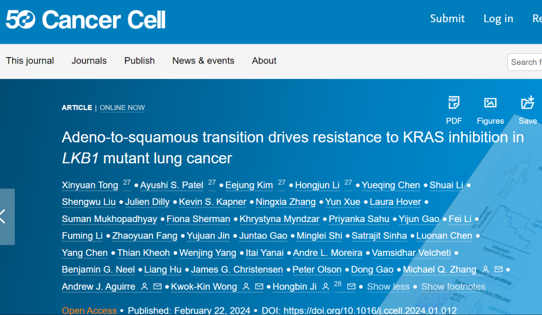 杰出校友、中国科学院分子细胞科学卓越创新中心季红斌研究员联合纽约大学医学院Kwok-Kin Wong团队,哈佛医学院丹娜法伯癌症研究所Andrew J. Aguirre团队以及清华大学张奇伟团队在Cancer Cell上发表文章 Adeno-to-squamous transition drives resistance to KRAS inhibition in LKB1-mutant lung cancer。该研究发现肺腺鳞癌转分化驱动KRAS靶向治疗耐药的产生,在深入解析其分子机制的基础上,鉴定KRT6A可以作为生物学标志物有效预测患者对KRAS靶向治疗的响应。