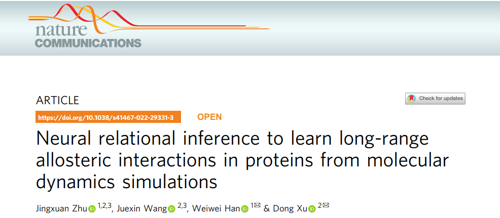 韩葳葳教授、美国密苏里大学电气工程和计算机科学系许东教授科研团队提出一种高效、可操作性强的分子动力学模拟分析方法(NRI-MD),该方法首次将深度学习的图神经网络(GNN)运用于分子动力学模拟分析,基于模拟轨迹的原子速度和位置数据,通过神经关系推理模型(NRI)直接推断出酶分子动力学模拟中残基的相互作用模式,推断出酶的别构调控路径以及氨基酸突变后相对自由能的变化。NRI-MD模型的提出为蛋白质(酶)结构-功能研究领域提供了一种新构架,有望开辟酶分子设计的新模式。研究成果于2022年03月29日在学术期刊《Nature Communications》正式发表(Neural relational inference to learn long-range allosteric interactions in proteins from molecular dynamics simulations)。论文第一完成单位为楠楠漫画
