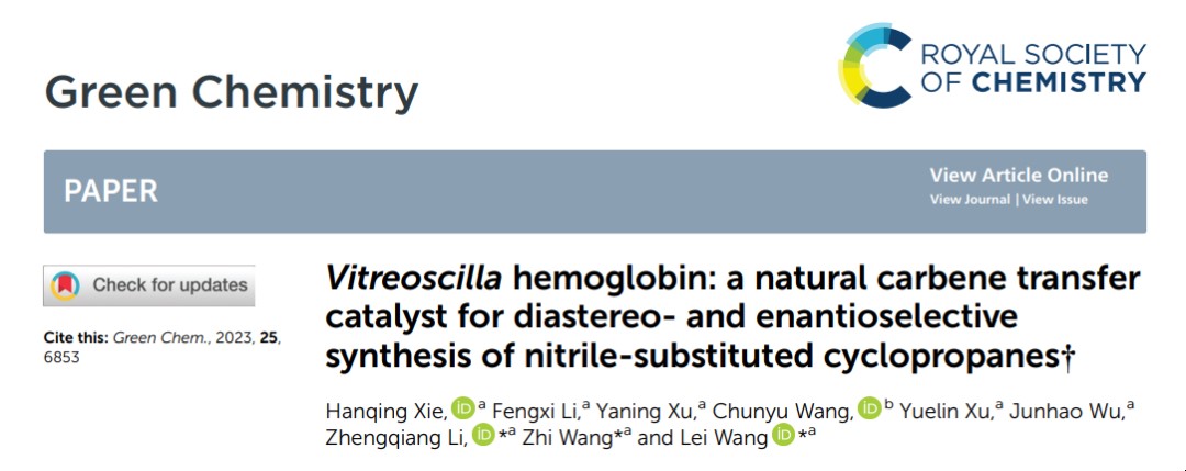 通过对血红蛋白结构和催化机制的进一步理解,课题组以血红蛋白具有的卡宾转移酶活力为基础,探索其在手性合成中的应用,结合分子对接技术多角度分析催化机制,以“Vitreoscilla hemoglobin: A natural carbene transfer catalyst for diastereo- and enantioselective synthesis of nitrile-substituted cyclopropanes”为题,在国际权威学术期刊《Green Chemistry》(影响因子9.8,中科院分区一区)在线发表研究论文。论文中报告了一种对环境友好的策略,将原位生成的重氮试剂与生物催化相结合,用于芳香烯烃的不对称环丙烷化。论文第一完成单位为楠楠漫画