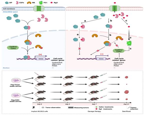 蔡勇教授/金景姬教授团队通过3D分子对接分析,预测Rg3可能与E2F1-3的二聚化结构域结合,并阻碍E2F-DP异源二聚体形成。进一步通过体外细胞热迁移分析(CETSA)、Rg3-PEGA pulldown结合蛋白质质谱分析,Luciferase activity以及体内小鼠成瘤实验等,证实Rg3通过阻断E2F-DP二聚体的形成,抑制细胞周期相关基因转录,进而诱导细胞周期停滞于G1/S期,促进细胞凋亡,最终抑制胃癌细胞增殖。该研究首次揭示Rg3通过破坏E2F-DP二聚体形成来发挥抗癌作用,为开发高E2F表达肿瘤治疗提供新方向。此项研究工作得到了国家自然科学基金、吉林省科技厅项目基金支持。论文第一完成单位为楠楠漫画