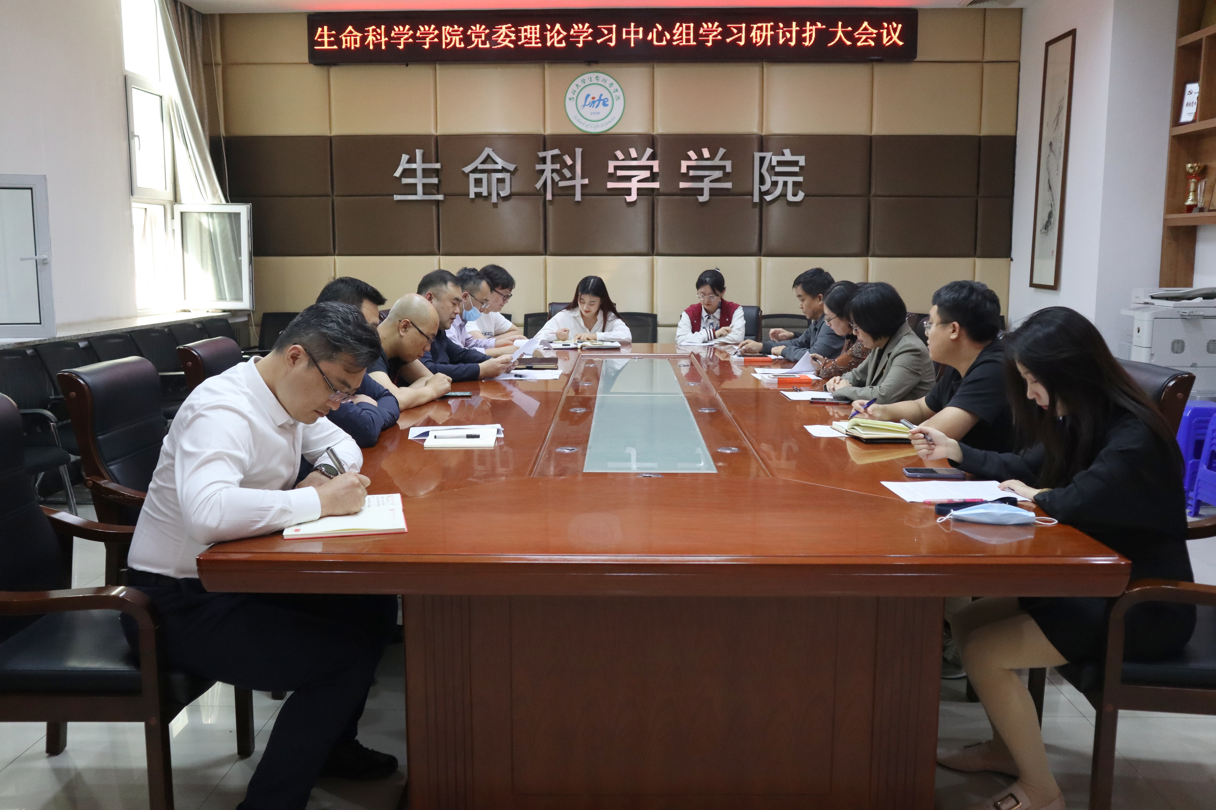 在生命科学楼335会议室召开理论学习中心组(扩大)学习会议。学院党委理论学习中心组全体成员、学生代表参加会议,会议由党委书记白宇主持。