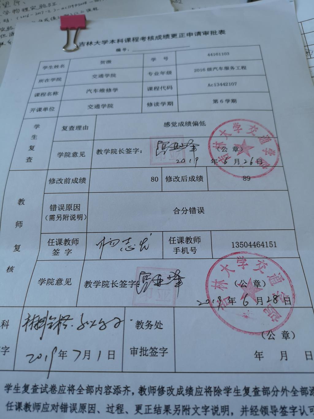 1.本科课程考核成绩更正申请审批表