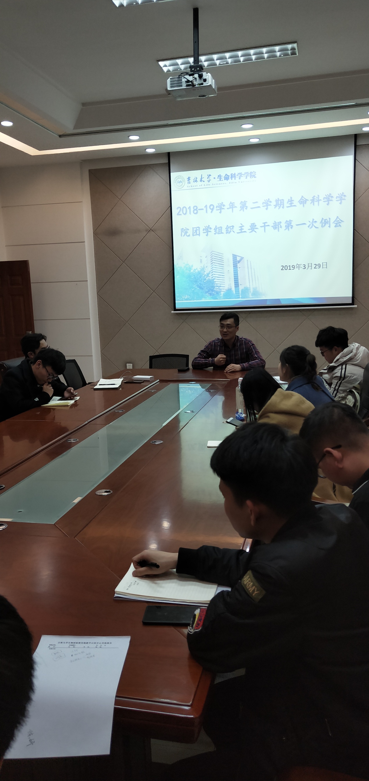 团学组织部长及以上主要学生干部在生命科学楼335会议室召开了新学期第一次工作例会。出席会议的有我院党委副书记崔帅,学生会主席丁是卯,团委副书记吴方帆、李美溪以及团学组织全体部长及以上干部。会议由崔帅书记主持。