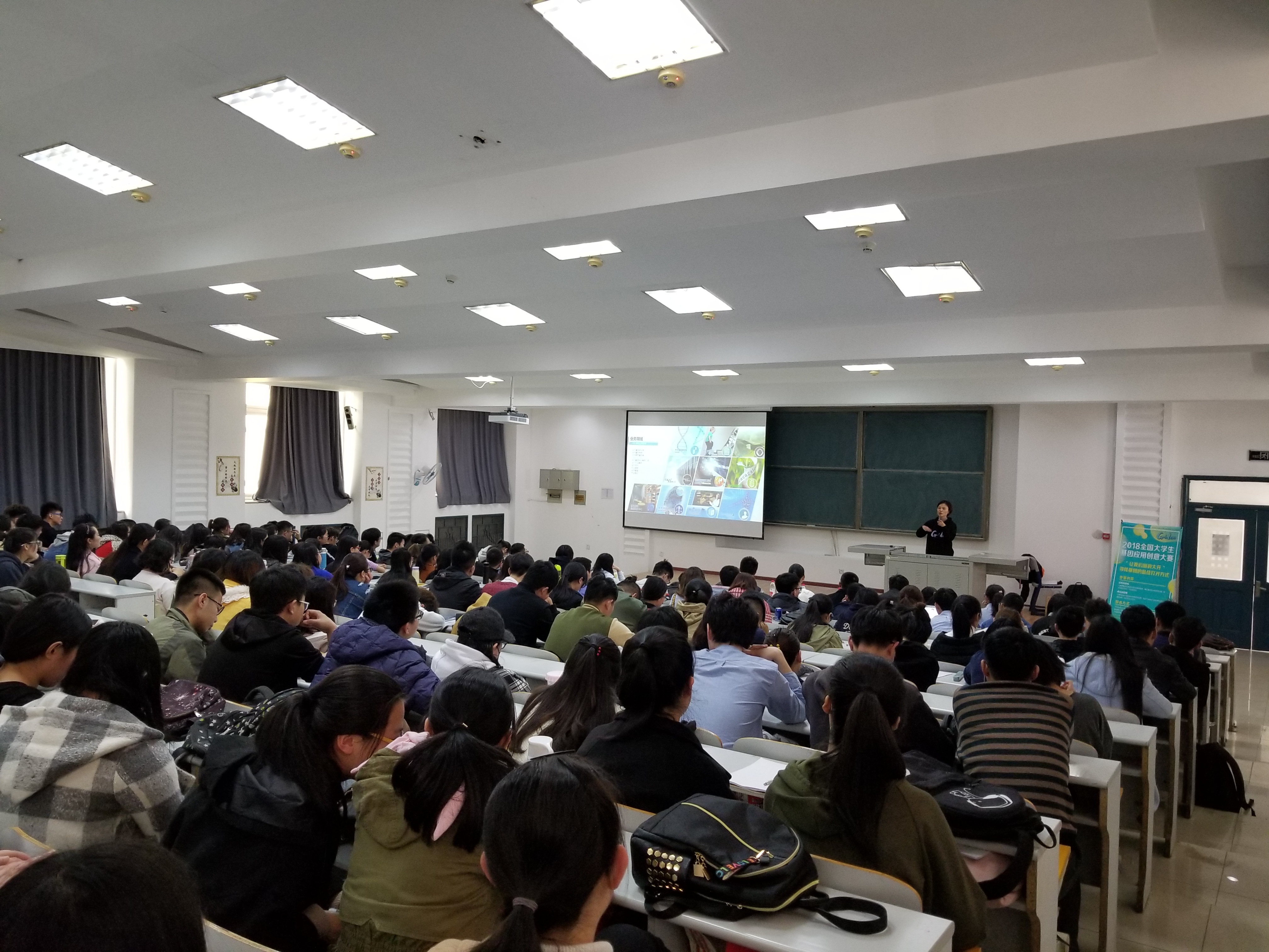 首先,华大基因蓝色彩虹品牌总监黎敏为同学们播放了两个短片。其一是关于华大近年的发展以及其主要发展方向的宣传片。其二是2017年第二届全国大学生基因应用创意大赛的花絮片。一方面使同学们对华大科技有了一个初步的认识,另一方面让同学们对全国大学生基因应用创意大赛有了大致的理解和印象。随后,华大基因蓝色彩虹品牌总监黎敏详细的介绍了华大基因的发展历程和由华大基因中蓝色彩虹项目牵头的全国大学生基因应用创意大赛流程,参赛条件以及奖项设置等详细信息。