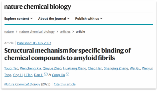 校友刘聪(中科院上海有机化学研究所生物与化学交叉中心)、李丹(上海交通大学Bio-X研究院)合作在Nature Chemical Biology期刊上发表了文章“Structural mechanism for specific binding of chemical compounds to amyloid fibrils”,通过综合运用生物与化学交叉研究方法,合作团队首次系统地揭示了具有不同结构的小分子化合物与蛋白病理聚集体相互作用的基本原理。该工作既是对经典小分子和蛋白互作理论的重要扩充,更使得基于结构开发神经退行性疾病小分子示踪剂成为可能。