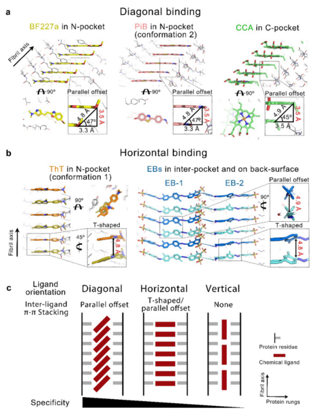 研究人员进一步发现具有不同骨架的化合物能够通过多种不同的取向结合到α-syn纤维的不同结合位点(图2a、2b),并定义了配体识别并结合纤维的三种主要的取向及结合模式:对角线取向(diagonal geometry,小分子平面与纤维轴呈约45º角)、水平取向(horizontal geometry,小分子平面平行于蛋白分子平面)、垂直取向(vertical geometry,小分子平面垂直于蛋白分子平面)。三种取向对应不同形式的配体-配体π-π相互作用,以及依次降低的结合特异性(图2c)。因此,除了传统的配体-蛋白质相互作用,配体-配体相互作用协同贡献了小分子结合淀粉样蛋白纤维的特异性。此外,研究人员在体外重组的α-syn纤维和来自多系统萎缩患者的离体α-syn病理纤维结构中发现了一个可靶向的高度保守的配体结合口袋。为基于此口袋的广谱型α-syn纤维示踪剂设计、筛选和优化提供了重要的设计思路和靶点。
